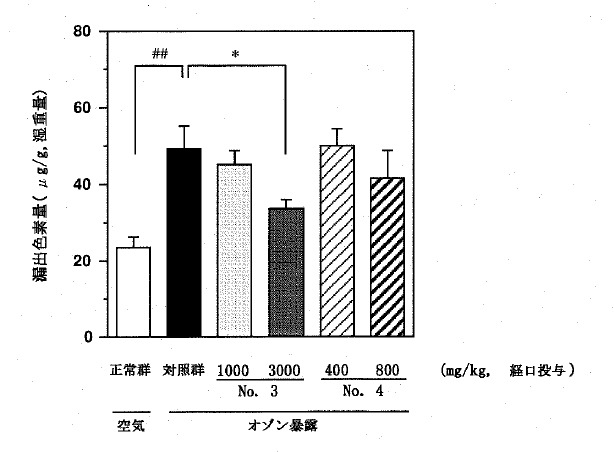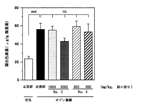 正常モルモット(オゾン非暴露群:注射用蒸留水投与群)の気管および主気管支における漏出色素量は23.5±3.0および23.4±3.1μgであった。これに対し、平均3ppmのオゾンガスを30分間暴露した対照群(オゾン暴露群:注射用蒸留水投与群)の気管及び主気管支における色素量は、それぞれ56.0±6.7および49.0±6.2μgと有意に増加し、血管透過性の亢進が認められた。