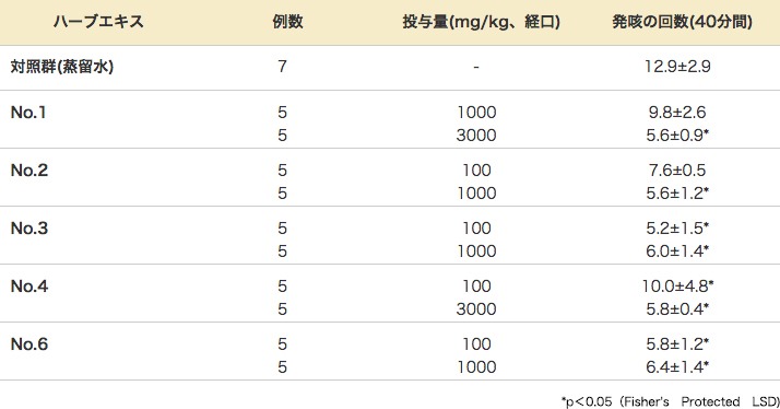 平均約3ppmのオゾンガスをモルモットに40分間暴露することにより、個体差はあるものの軽い単発の発咳や激しい連続した発咳が観察され、対照群(注射用蒸留水投与群)の平均発咳回数は12.9±2.9回であった。検体No.2、No.3、No.6は1000mg/kgで有意に発咳回数が減少した。