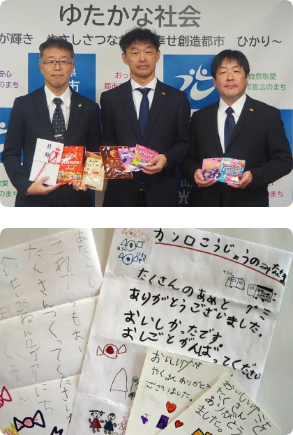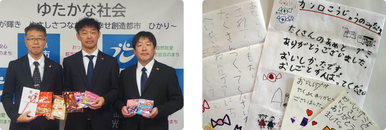 創業80年を迎えた平成4年より記念事業として、工場のある3拠点(山口県光市、長野県松本市、長野県朝日村)に、カンロ商品を寄贈しています。