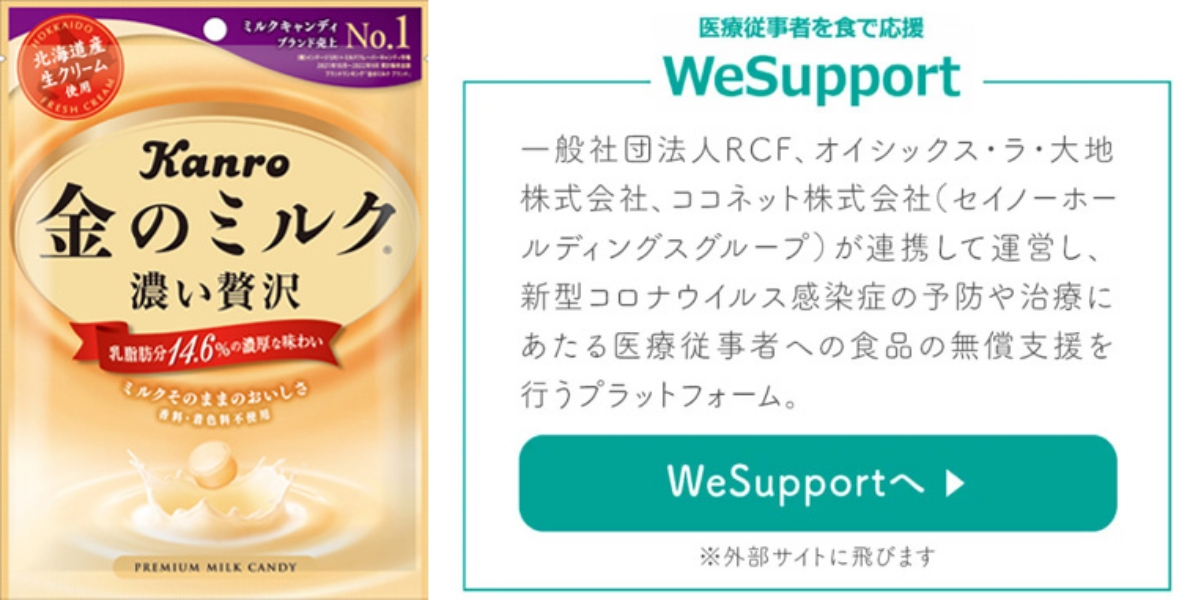 2020年より、医療従事者への食品の無償支援を行うプラットフォームである「WeSupport」を通じて、金のミルクの寄贈を行っています。