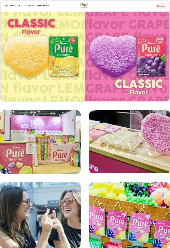 The marketing departments and the brand development departments have joined forces, fostering and strengthening existing mainstay brands, including Kanro Ame, Kin no Milk, Kenko Nodoame, Sugar-Free, Puré Gummy, and Candemina.