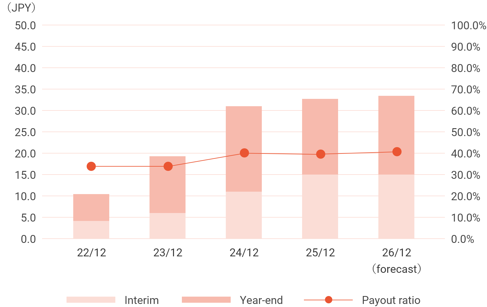 Returning profits to shareholders is an important policy, and under the “Medium-Term Corporate Strategy 2030” we have set a floor of 93 yen (31 yen after share split) per share, based on a 40% dividend payout ratio. Through growth in operating cash flow, the Company will achieve both investment in growth and stable dividends.