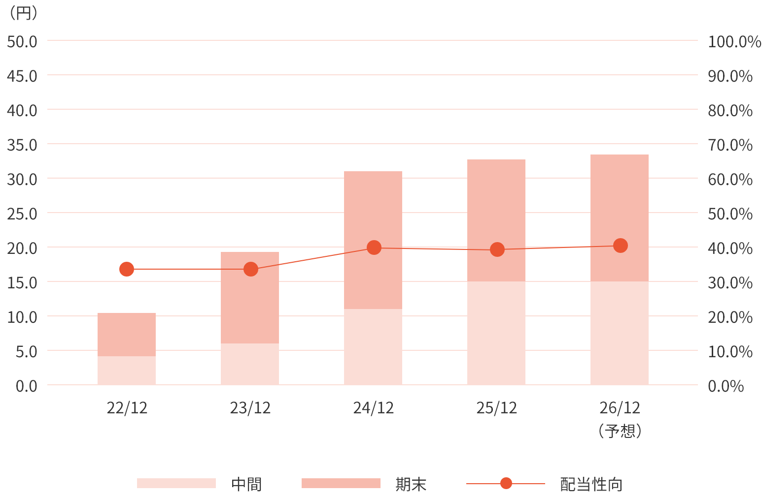 株主の皆様への利益還元は重要な政策であり、「中期経営計画2030」においては、配当性向40%を基本に1株あたり93円(分割後31円)を下限に設定することを株主還元方針といたしました。営業キャッシュフローの伸長により、成長投資と安定配当を両立してまいります。