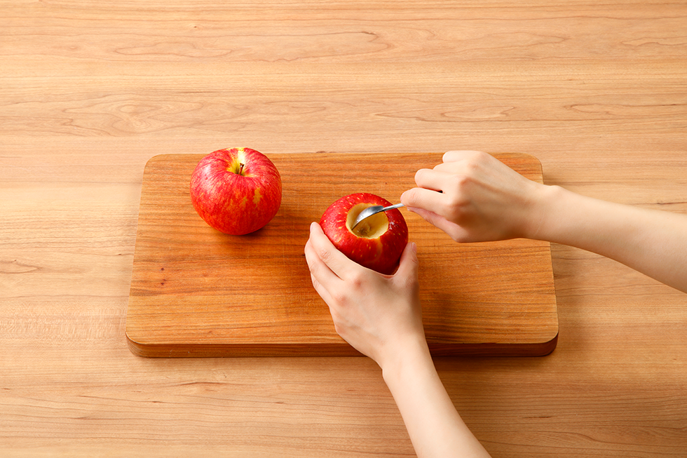 りんごは芯の周りに切り込みを入れ、スプーンなどで芯を取る。