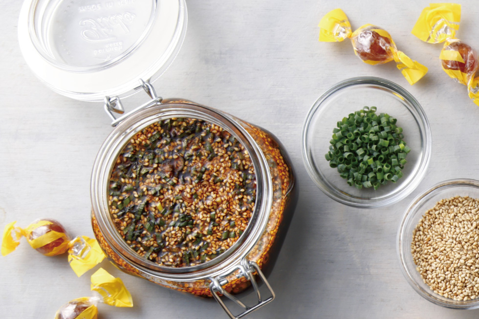 熱湯消毒した保存容器にカンロ飴醬油、皮をむいたにんにく、赤唐辛子を入れ、3日以上漬ける。