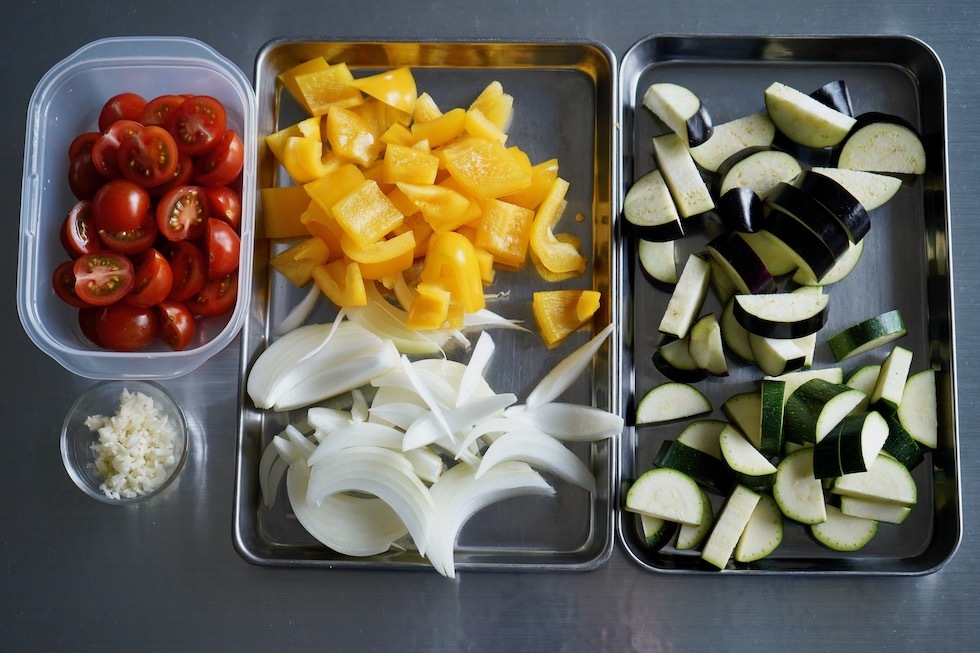 なす、ズッキーニは1cm厚さ程度の半月切りに、パプリカはへたと種を取り2cm大程度に切る。