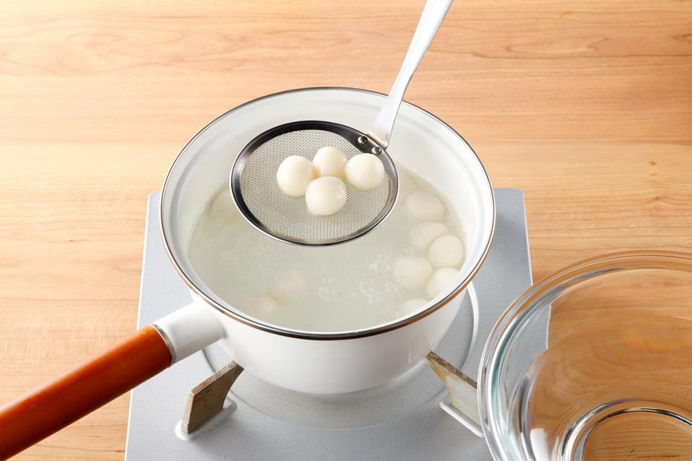 白玉を熱湯で10分ほど茹で、冷水に取る。