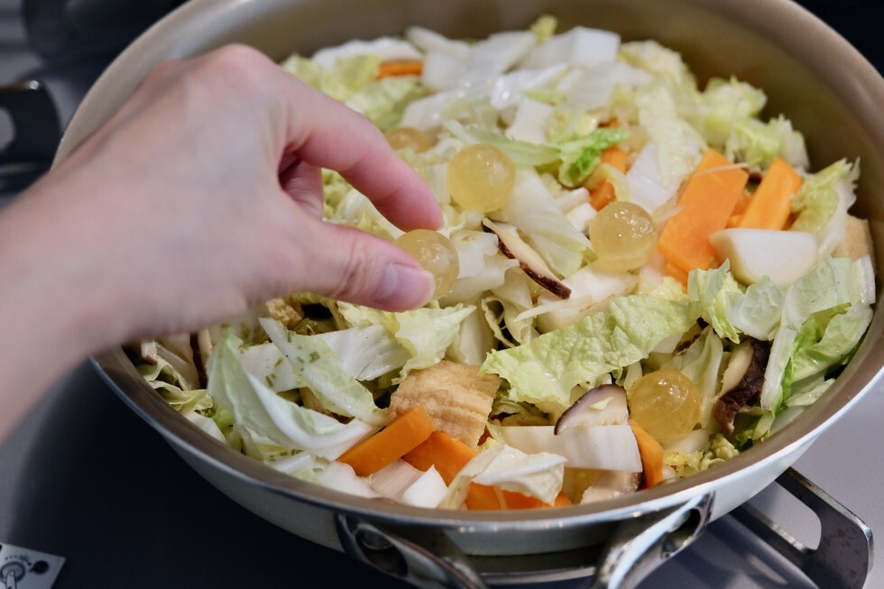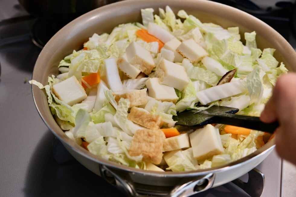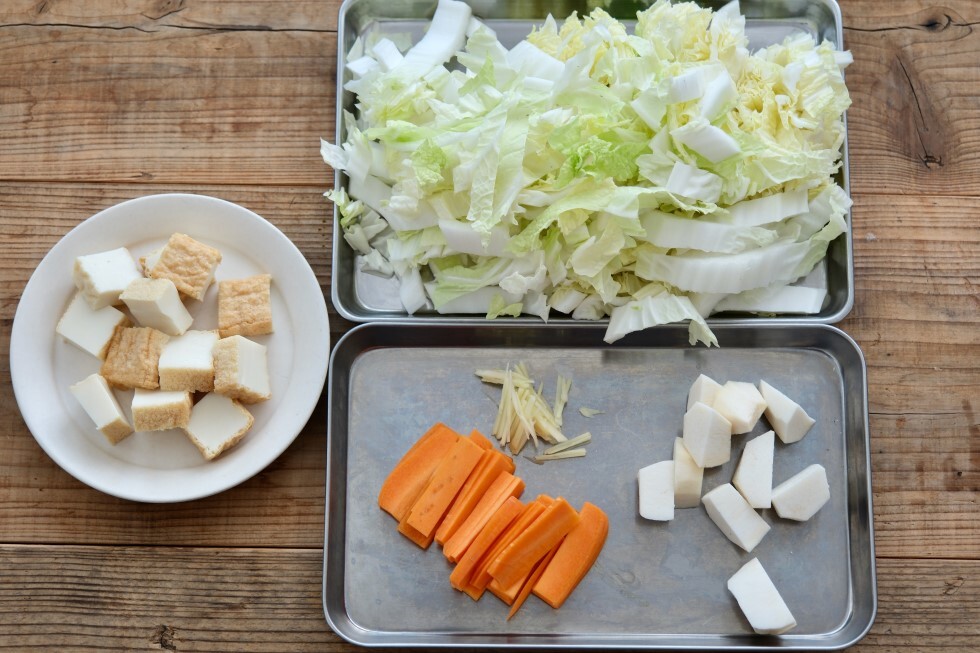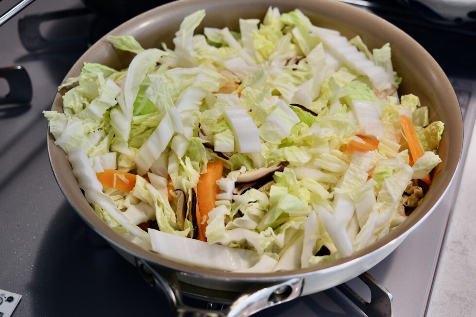 フライパンに油をひき、白菜、にんじん、里芋、しいたけ、しょうがを入れて中火で3分程度炒める。