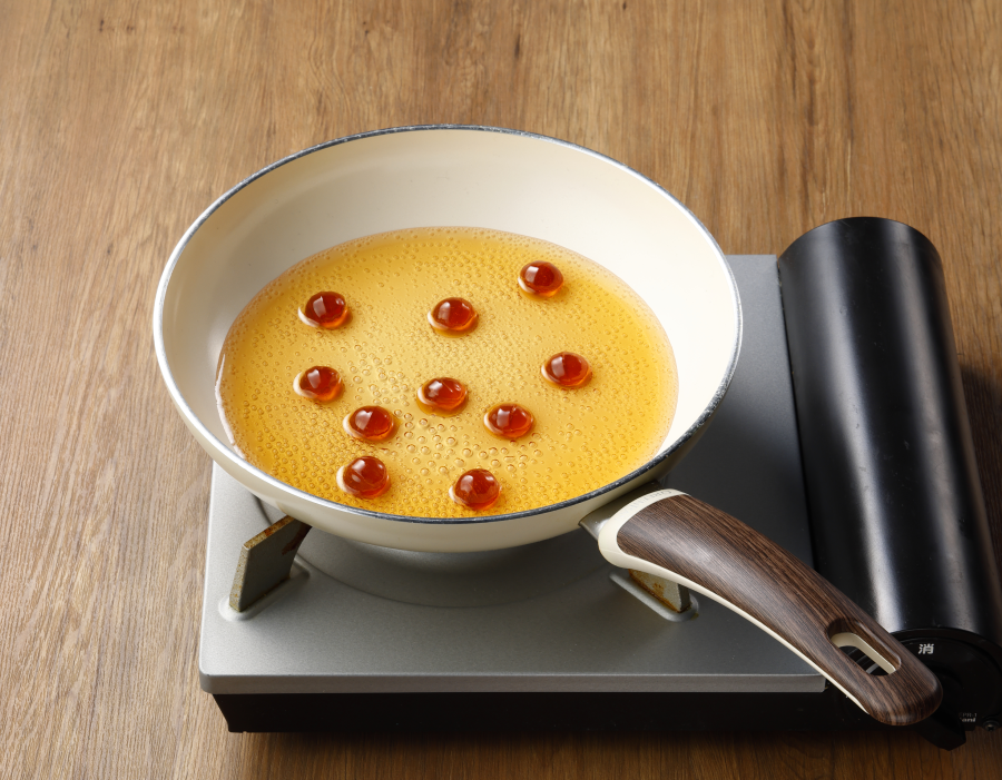 フライパンにカンロ飴、水を入れて火にかける。沸騰したら弱火にし、時々混ぜながらカンロ飴が溶けるまで火にかける。(約15分)