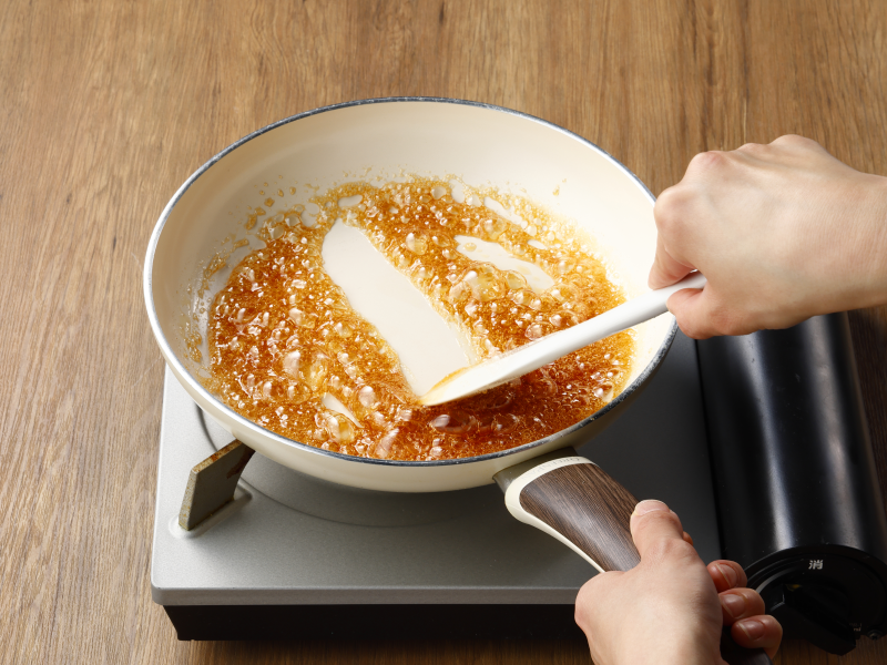 カンロ飴が溶けたら中火にして煮詰める。(約3分)