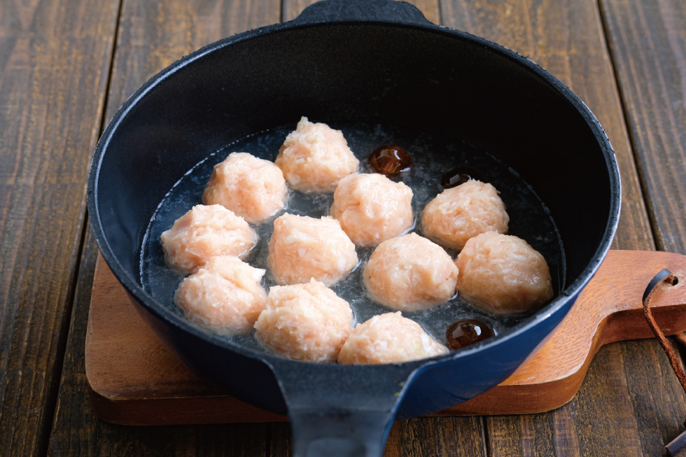 ボウルに鶏ひき肉、塩、こしょう、片栗粉、玉ねぎを入れ、練るようにしてよく混ぜ合わせ、一口大に丸める。