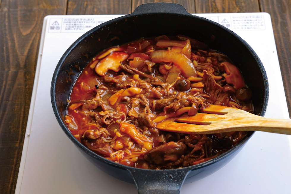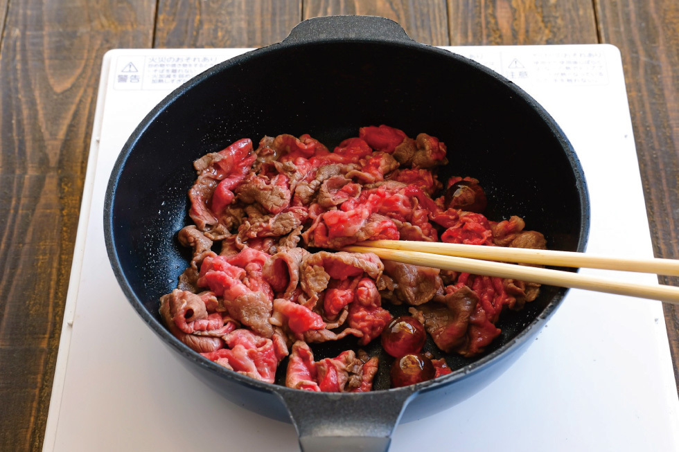 牛肉は先にカンロ飴と共に炒めることで煮込まなくても旨味が増します。煮込まず後から加えることで固くならずに柔らかく仕上がります。