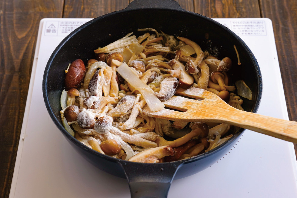 玉ねぎが透き通ってきたら、きのこを入れて炒める。しんなりしてきたら薄力粉を加え、粉っぽさが無くなるまで炒める。