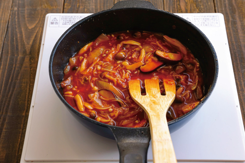 一度弱火にして【A】を入れ、混ぜながら中火で温める。とろみがついてフツフツしてきたら弱火にして4分煮る。