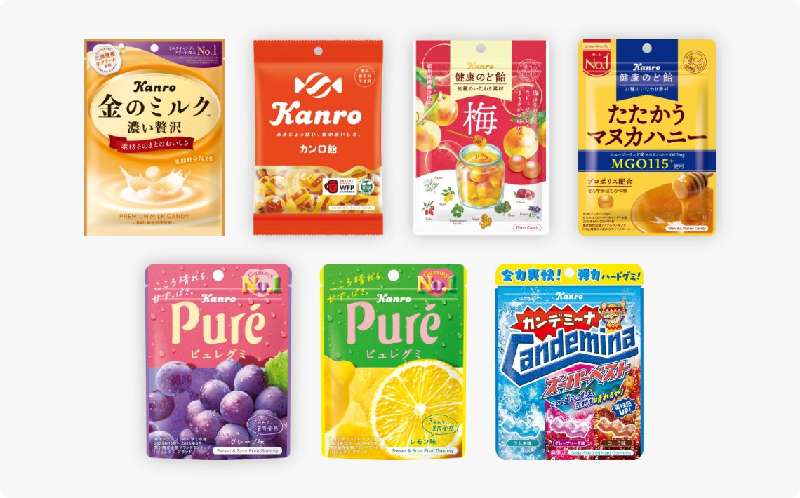 カンロは、創業以来100年を超える歴史を持ち、「カンロ飴」や「健康のど飴シリーズ」などのロングセラー商品を丁寧に育成する一方で、「金のミルク」「ピュレグミ」や「カンデミーナグミ」など独創的な開発力と高度な技術で新しい市場を創造してきました。